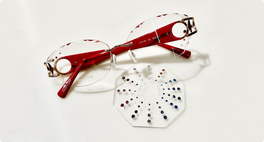 大胆なレンズカットに繊細に施されたデザイン模様…さらにレンズに直接埋め込まれた色とりどりのストーンが女性の顔を魅力的に演出します。