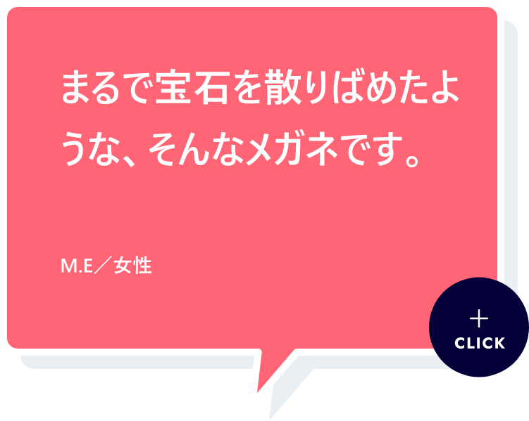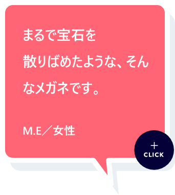 ブランドコンセプトは「メガネ選びは楽しいこと」私のモットーとこんなにも一致するブランドは他にはないと思います。選ぶ楽しさたっぷりのデザインは、掛ける私も、見る人の気持ちも明るく楽しくしてくれます❤ M.E/女性